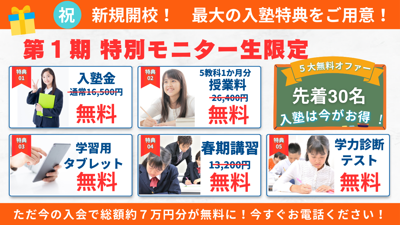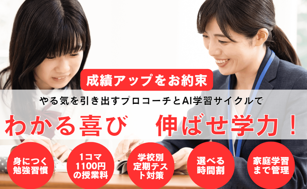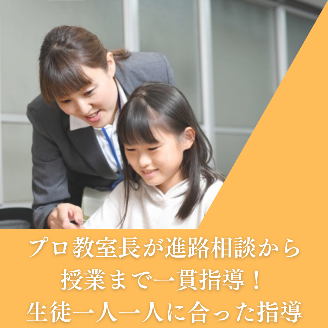 当塾は、長所を伸ばし、苦手を効率的に解消することのできるAI搭載のICT教材を利用した圧倒的演習量と、プロの教室長による一人一人の子供たちの特性に合わせ、それぞれに合った正しい勉強法の指導を行い、成績アップを実現していく進学個別指導塾です。子供たちの勉強に対するモチベーションを引き出し、自ら学ぶ力を身に着けた生徒を育成することを教育目標にしています。