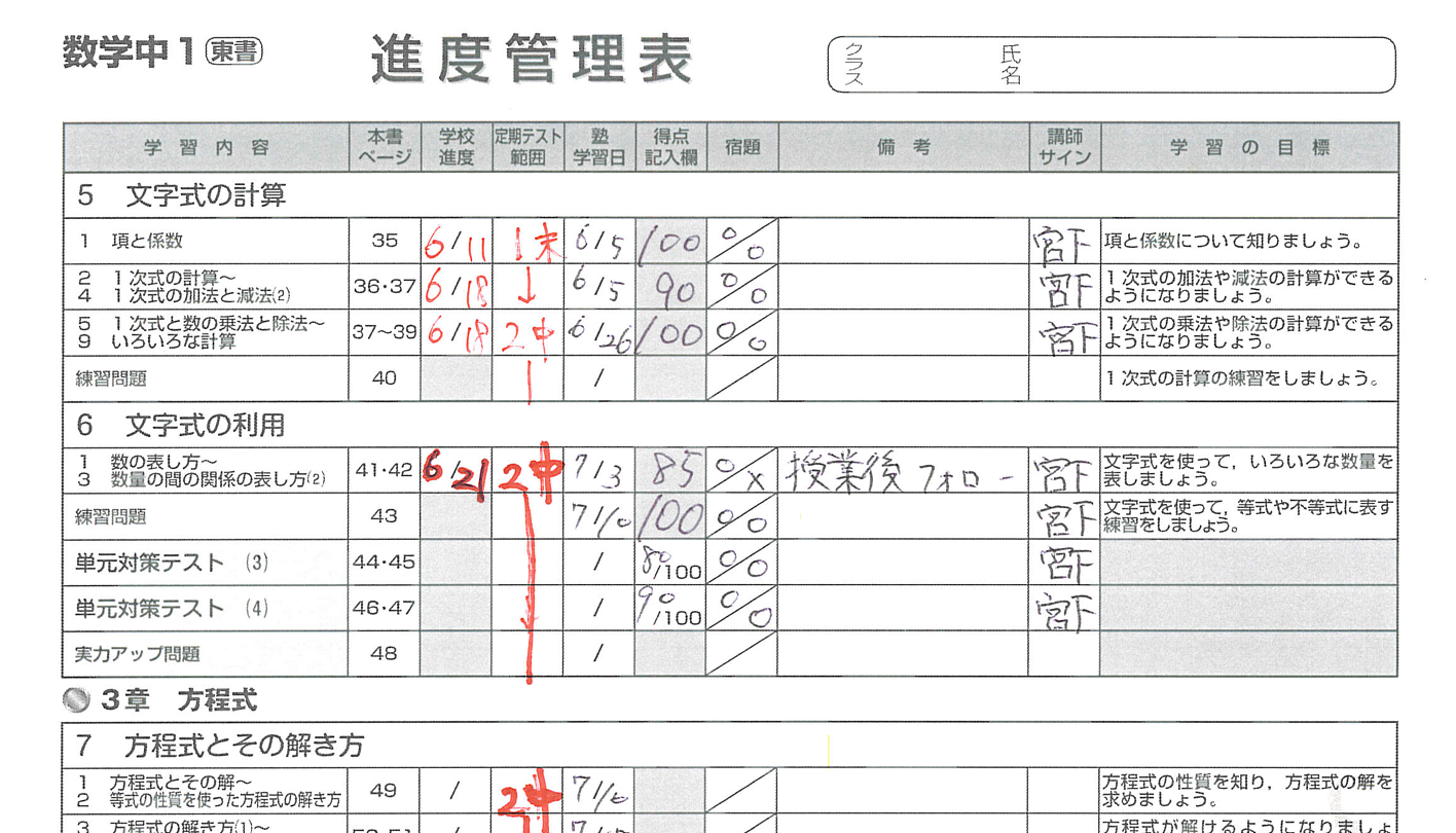 学校の進捗状況や定期テストまでの期間、本人のやる気と能力を考え、