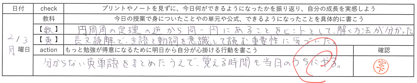 ジャーナルは、社会人の自己啓発にも使われる手法の一つです。自分の行動を振り返り、毎回担当の先生がチェックをしていきます。勉強面での成長はもちろん、勉強を通して人間的成長ができる機会を提供します。